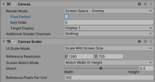UI를 캔버스에 그릴 경우, 캔버스의 가로세로 비율 또한 조정을 해야 할 수 있다. 대게의 경우는 아래와 같은 방법으로 비율을 조정할 수 있다. 이때 조심해야할 것은 가급적이면 Render Mode를 Screen Space - Overlay를 선택하도록 하자. (너무 많은 블로그에서 아무런 생각도 없이 Screen Space - Camera를 추천한다.)