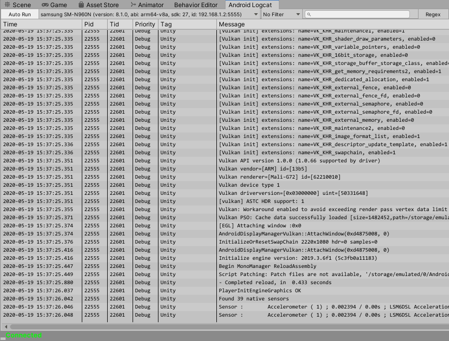 Overview Android Logcat Package is a utility for displaying log messages coming from an Android device in the Unity Editor. Read more about Android Logcat Document. Requirements Compatible with Unity 2019.1 or above. Requires Unity's Android support module