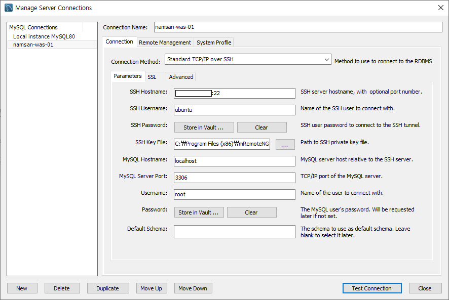 ubuntu에서 apt-get으로 mysql-server-8.0을 설치하고, mysql service를 올렸다. 그리고 원격에서 접속을 하기 위해 mysql workbench에서 접속설정을 아래와 같이 했다.