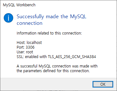 ALTER USER 'root'@'localhost' IDENTIFIED WITH mysql_native_password BY 'password';콘솔에서 root의 비밀번호를 설정한 후, mysql workbench에서 접속 테스트를 해보았다. 결과는 성공