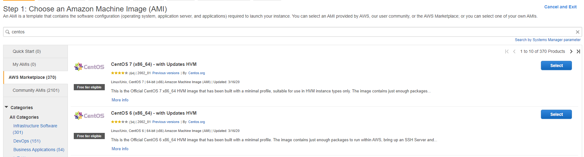 물론 AWS Marketplace를 통해 CentOS를 선택할 수 있다. 물론 Market Places를 통해 Cent OS를 선택할 수 있다. centos.org에서 공개한 6, 7 공식 instance도 있다. 이건 무료인데, 안타깝게도 8버전은 2020년 9월 26일 현재 기준으로 안올라온 듯 하다.