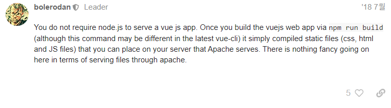 포럼에 올라온 답변에 따르면 vue.js의 실행에서는 node.js를 필수로 요구하지 않는다. npm을 통해 build가 된 이후에는 static file 로 컴파일이 되며 이러한 정적 리소스 파일들은 전통적인 방법처럼 이용할 수 있다.