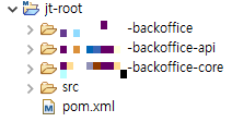 <project xmlns="http://maven.apache.org/POM/4.0.0" xmlns:xsi="http://www.w3.org/2001/XMLSchema-instance" xsi:schemaLocation="http://maven.apache.org/POM/4.0.0 https://maven.apache.org/xsd/maven-4.0.0.xsd"> <modelVersion>4.0.0</modelVersion> <groupId>com.****</groupId> <artifactId>jt-root</artifactId> <version>0.0.1-SNAPSHOT</version> <packaging>pom</packaging> <modules> <module>****-backoffice</module> <module>****-backoffice-api</module> <module>****-backoffice-core</module> </modules> </project>root 혹은 parent의 maven project는 packaging을 pom으로 갖는다.