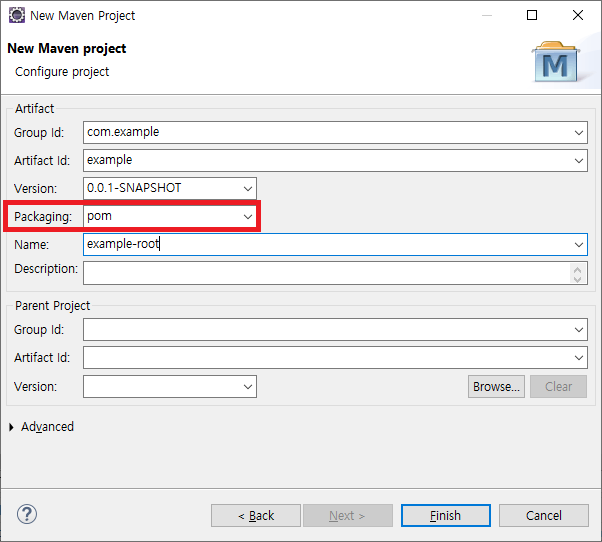packaging은 pom으로 선택해주자.