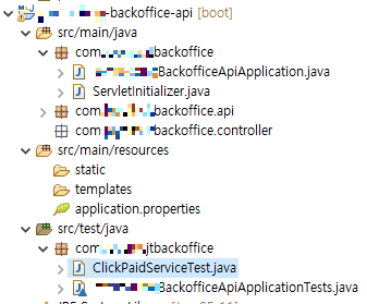 api 서버의 구성 @SpringBootTest @ContextConfiguration(classes=****BackofficeApiApplication.class) public class ClickPaidServiceTest { Logger logger = LoggerFactory.getLogger(ClickPaidServiceTest.class); @Autowired ClickPaidService cps; @Test public void test() { int a = cps.selectCount(Date.valueOf("2020-10-21"), 20); logger.info(""+a); } }다만 core 프로젝트를 참조하는 다른 프로젝트에서 JUnit을 통해 단위 테스트를 할 때는 ContextConfiguration을 통해 Application.class 를 지정해주어야 한다. 그렇지 않으면 중복되는게 있다고 에러 메세지가 뜬다.