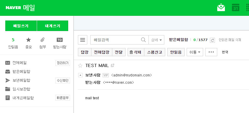 220 ip-172-*** JAMES SMTP Server Server (JAMES SMTP Server ) ready HELO mydomain.com 250 ip-172-*** Hello mydomain.com [61.***.***.***]) AUTH LOGIN 334 VXNl**** YWRt**** 334 UGFz**** dGVz**** 235 Authentication Successful MAIL FROM: <admin@mydomain.com> 250 2.1.0 Sender <admin@mydomain.com> OK RCPT TO: <****@naver.com> 250 2.1.5 Recipient <****@naver.com> OK DATA 354 Ok Send data ending with <CRLF>.<CRLF> SUBJECT: TEST MAIL FROM: <admin@mydomain.com> TO: <****@naver.com> mail test . 250 2.6.0 Message received발송하면 실제로 외부 메일 (네이버)로 발송이 되게 된다.
